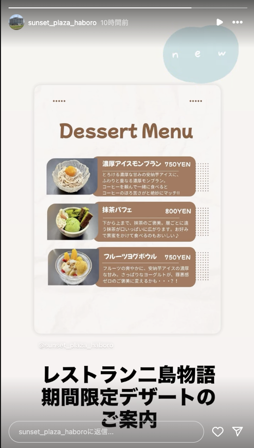 レストラン二島物語期間限定デザートのご案内です ※はぼろ温泉サンセットプラザ