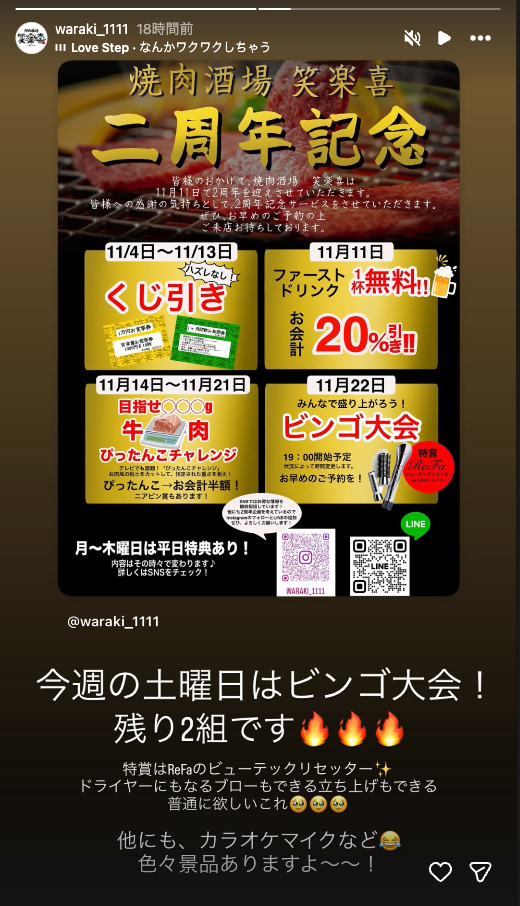 今週の土曜日はビンゴ大会です @焼肉酒場笑楽喜