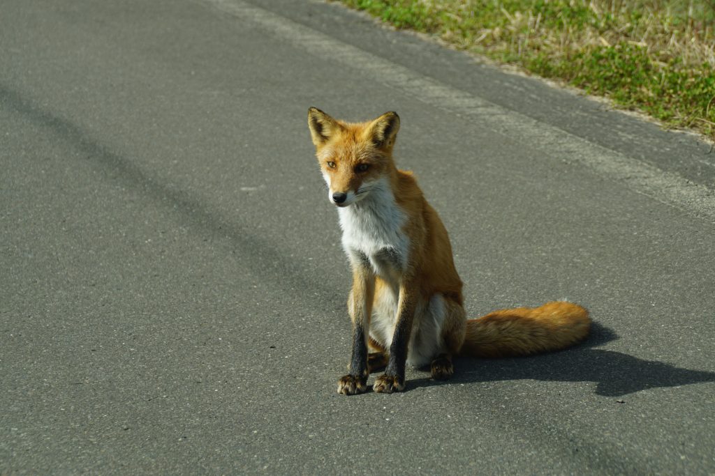 道の真ん中に狐が出てきて動こうとしません。何か言いたいのか、ただの日向ぼっこなのかわかりませんが。