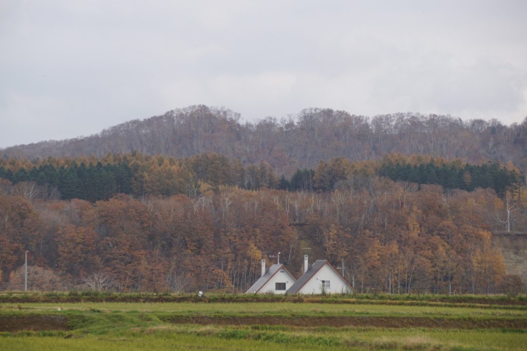 どんよりとして今にも降り出しそうな空模様です。ぶらりと秋を探しに出かけると、刈り取った後の畑に白鳥が羽を休めています、最後の渡りの群れでしょうか。